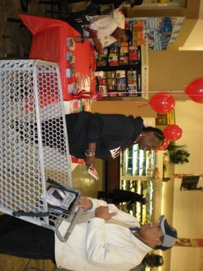 People interacting inside a store with balloons and shopping carts.