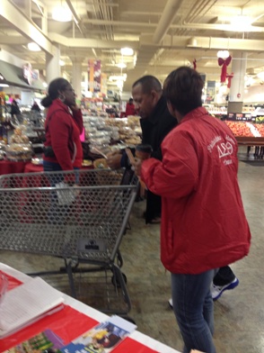 Two employees in red jackets assisting a customer with a shopping cart.